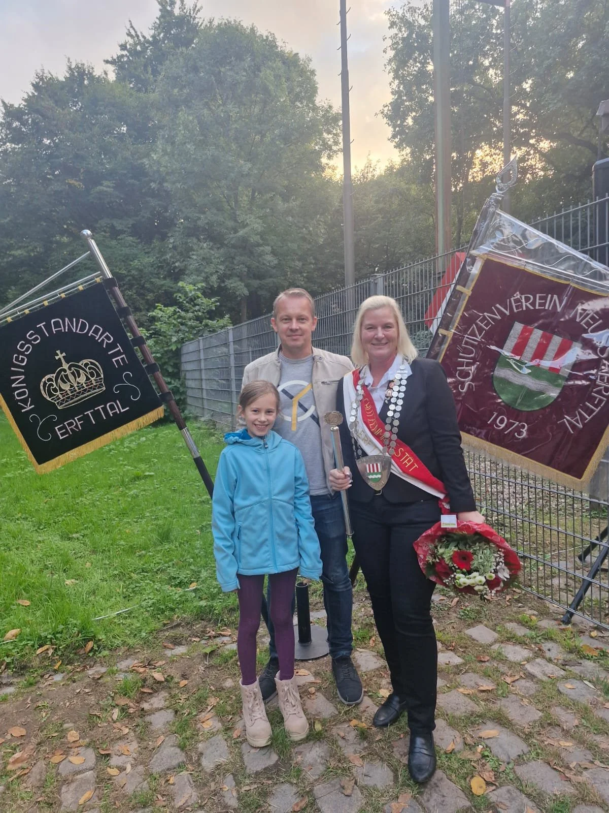 Neue Regimentskönigin wurde Manuela Maduch vom Damenzug „Erfttaler Mädchen“. Mit dem 44. Schuss sicherte sich die Mutter von drei Kindern die Königswürde. Sie wohnt in Norf, arbeitet als Objektleiterin in Neuss und ist im Verein für ihre Hilfsbereitschaft bekannt. Bei allen Aktivitäten ist sie stets mit Herz und Einsatz dabei.